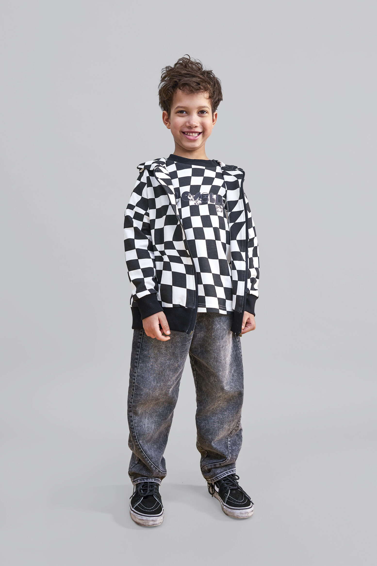 Czarna bluza rozpinana w szachownicę z kapturem to bardziej stonowana, ale wciąż stylowa propozycja.