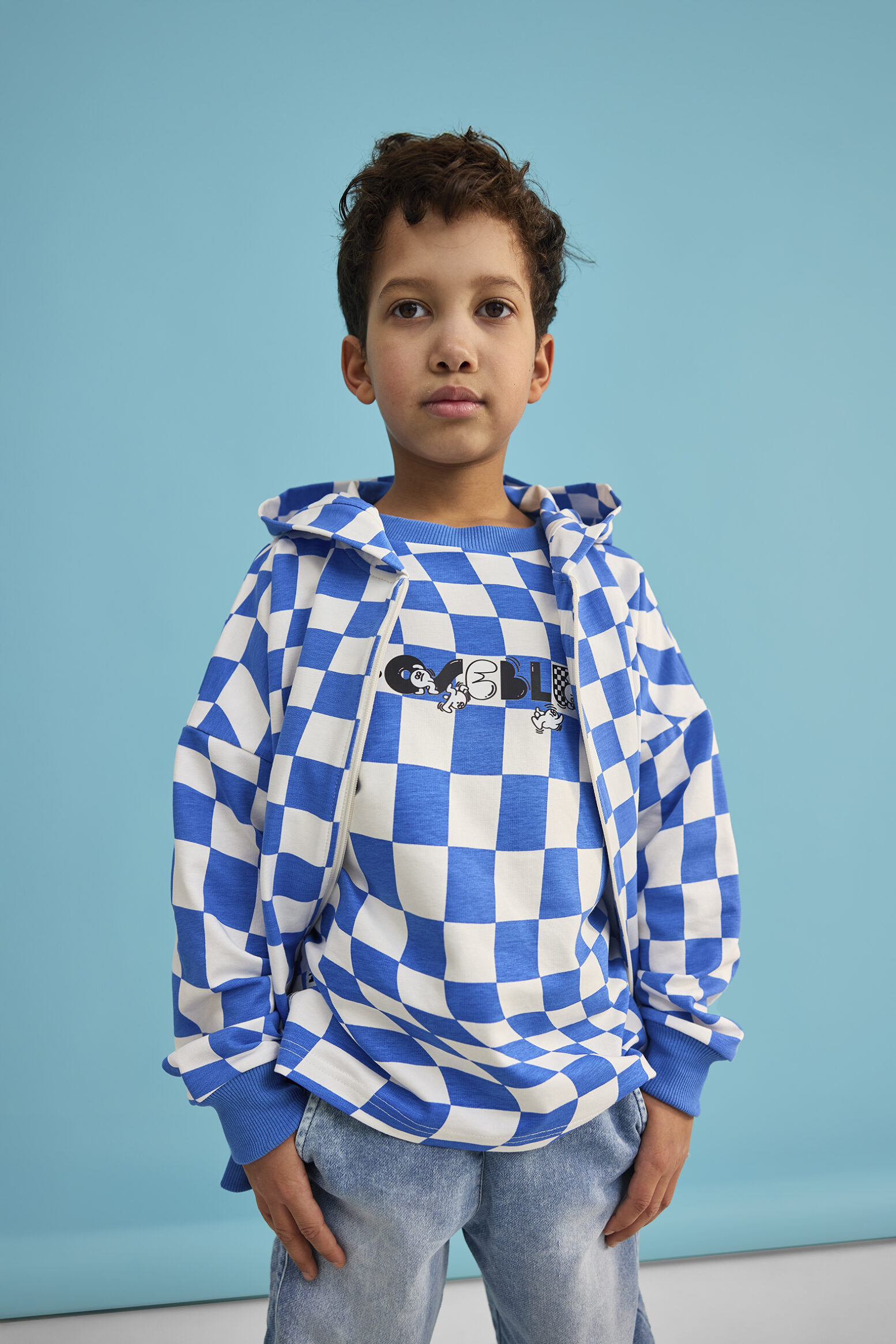 Niebieska bluza rozpinana w szachownicę z kapturem to wyrazisty element codziennych stylizacji.