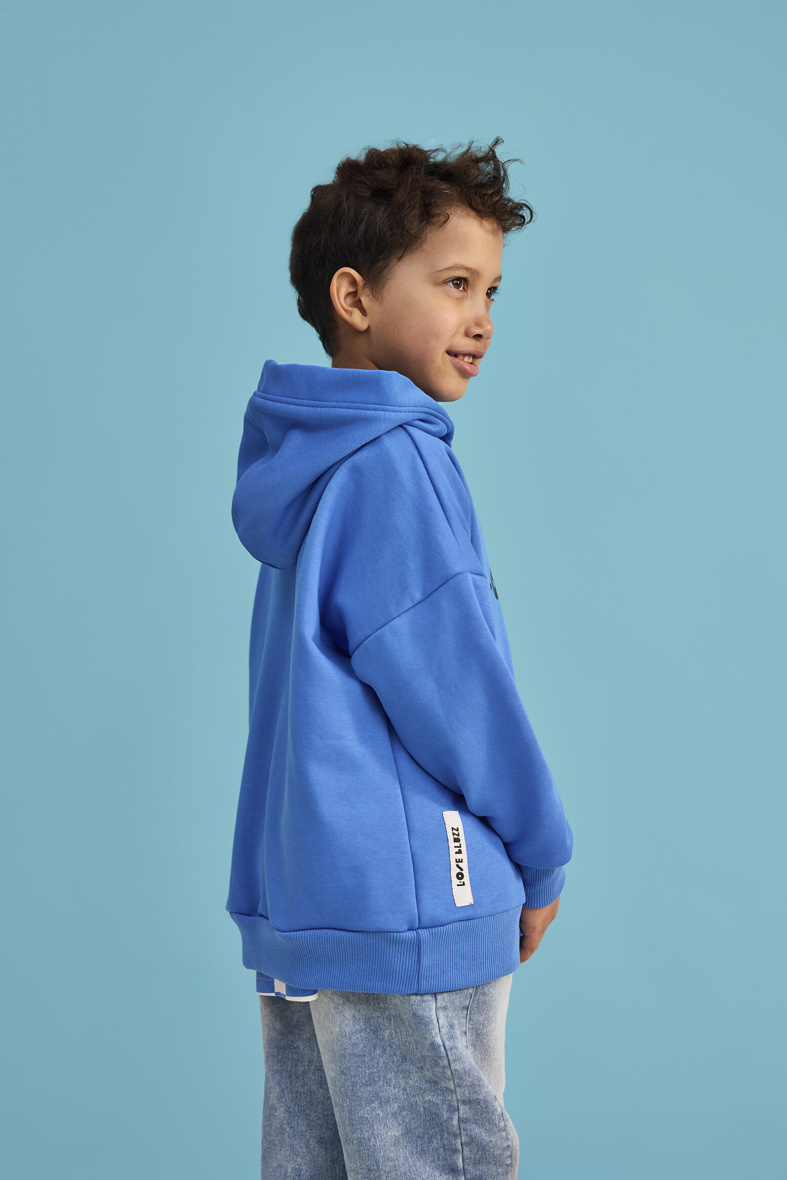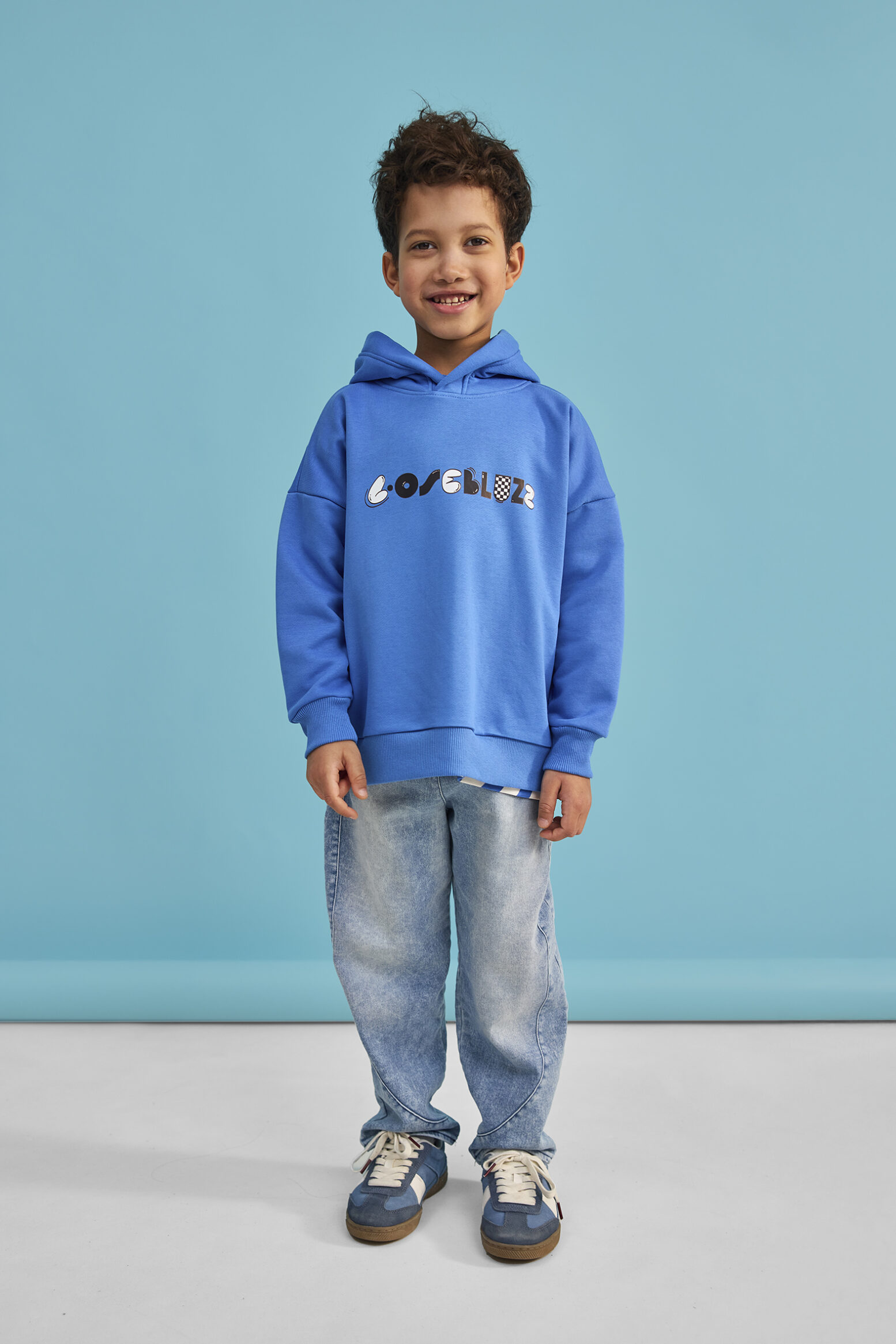 Niebieska bluza z kapturem i napisem „Loose Bluzz” wyróżnia się swobodnym, nowoczesnym charakterem.