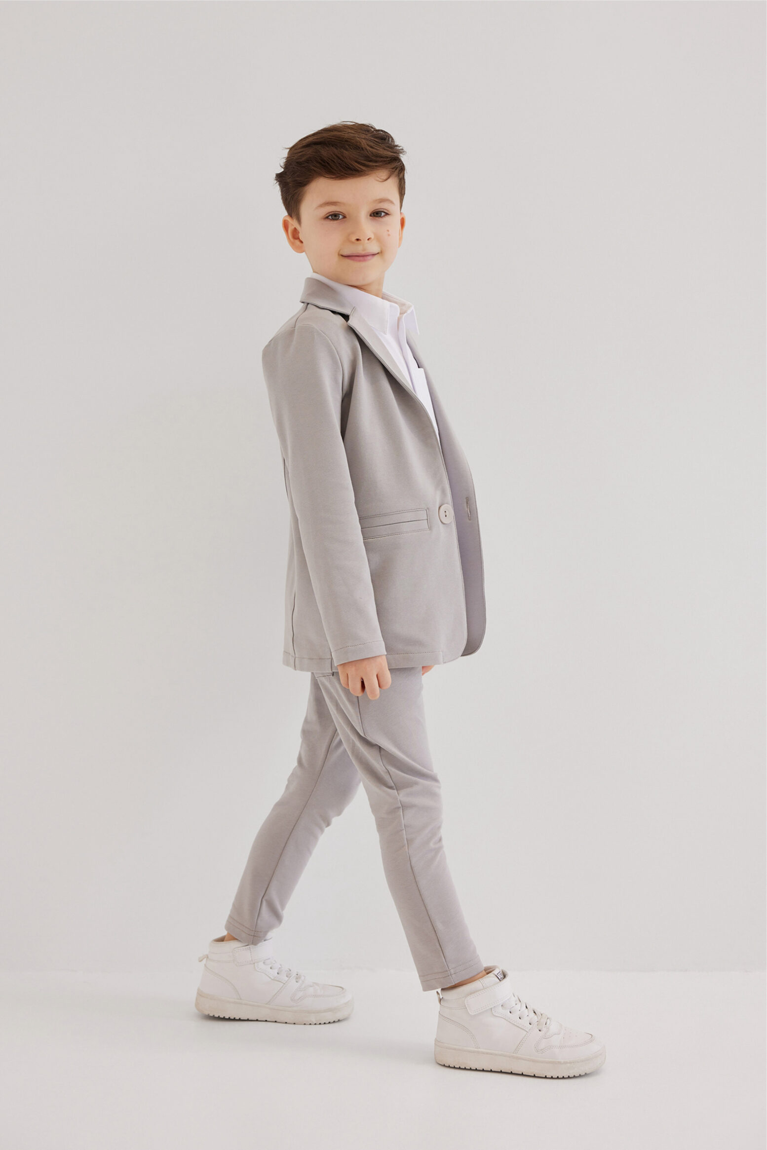 Szare spodnie chłopięce o klasycznym kroju łączą komfort noszenia z elegancją.